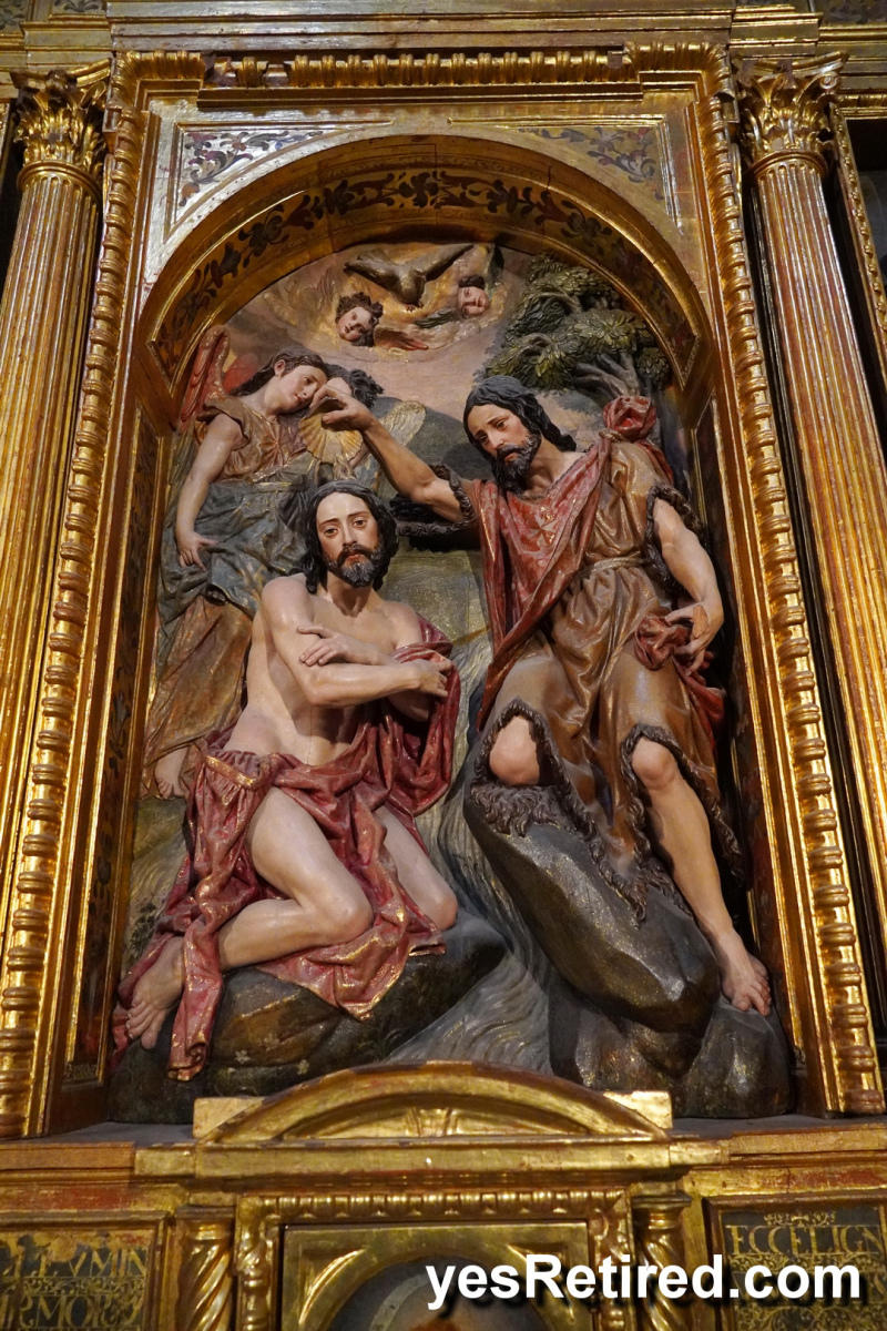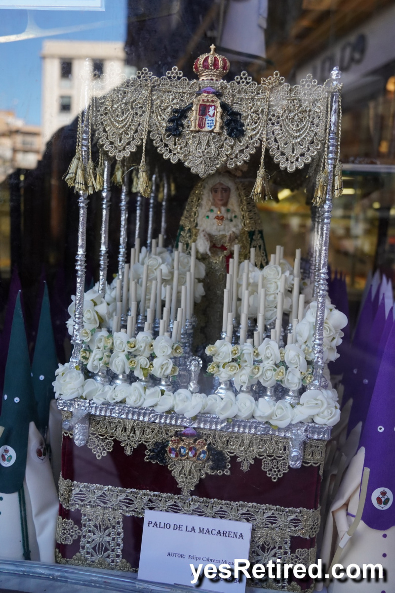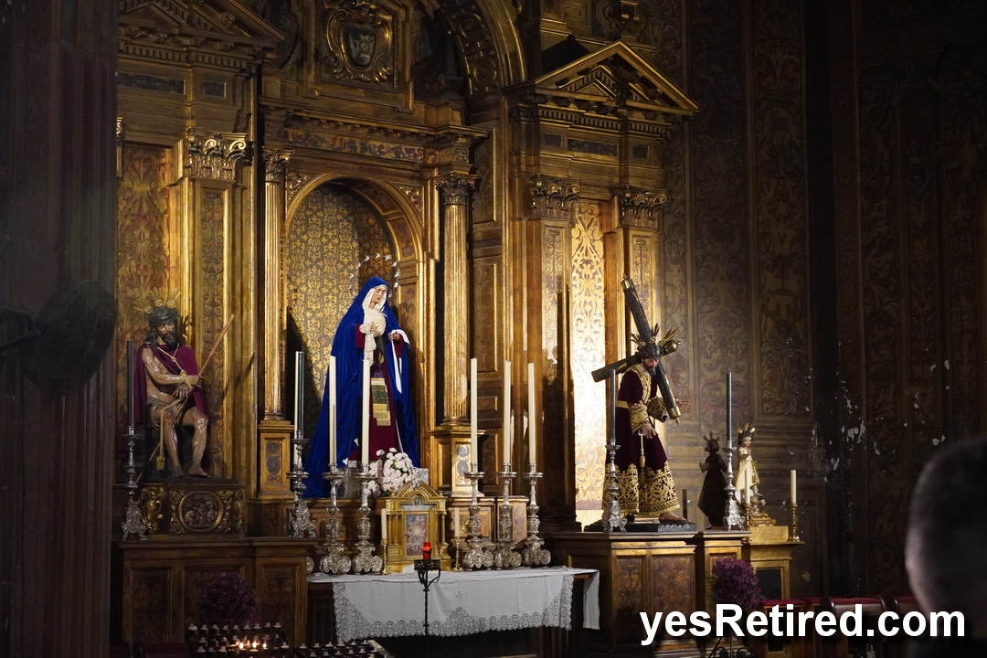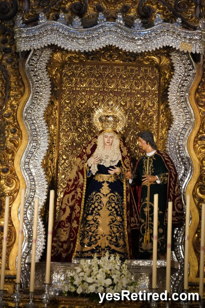 Many have a highly decorated depiction of the Virgin Mary, and lots of candles. Many of the polychrome artworks are painted 3D wooden carvings of people, with amazing detail originating from the 16th century. One group wears distinctive colored tall pointy hats with their faces masked as a part of the ceremony.