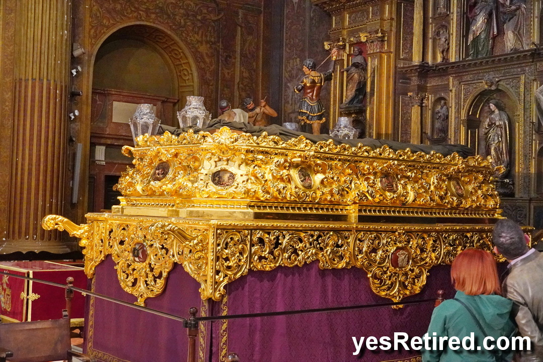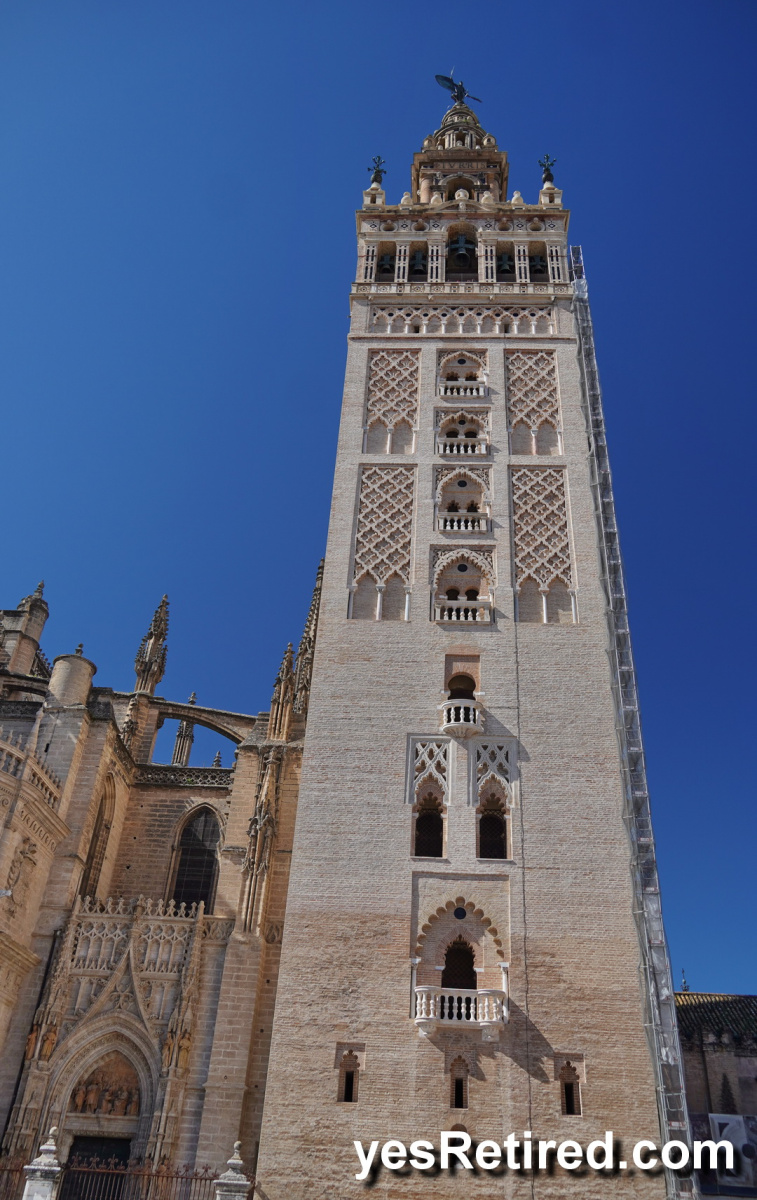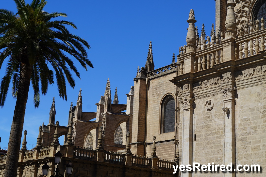The Gothic Cathedral and associated bell tower (104 M) the Giralda is impressive from the outside. Inside requires ticket. The bell tower was actually a minaret during Moorish times. The scaffolding on the right side has a stairway for the workers to start their day with a good climb.