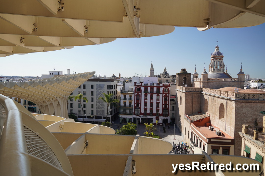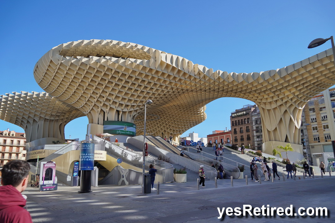 Funky Mushroom honeycomb wooden art structure, Setas de Sevilla. An elevator takes you up to various pathways on the top with great panoramic views of the city. Be sure to watch the free 4D / 180 degree panoramic movie.