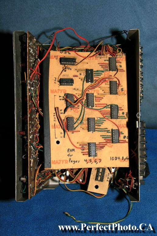 The circuit board shown here was an evolution of the original 256 Byte design, adding 1024 more bytes (1K). I used a kit from Radio Shack to etch the copper backed circuit boards, using my own designs, based on the schematic.
